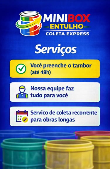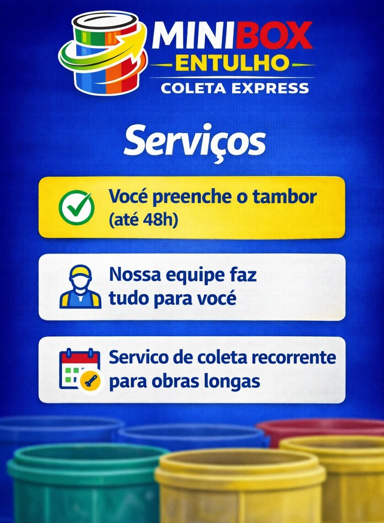 Somos especialistas em coleta rápida de pequenos volumes de entulho, com tambores práticos para facilitar seu descarte.